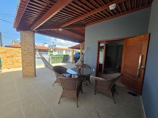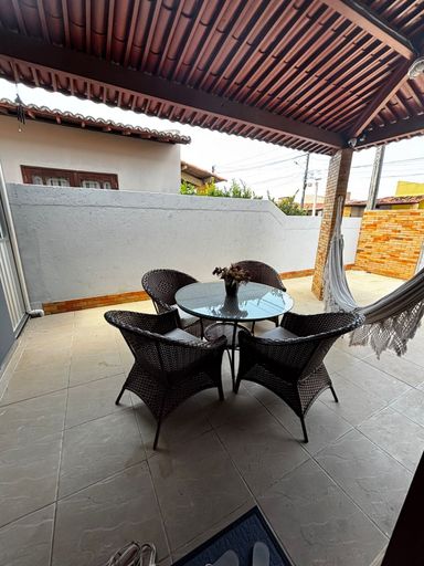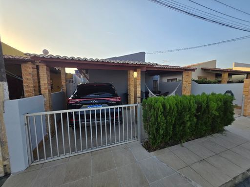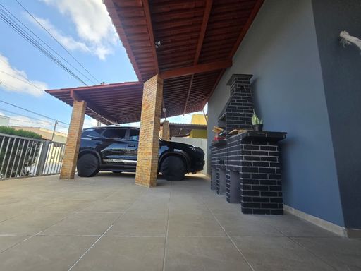 A casa tem garagem coberta, varanda e churrasqueira